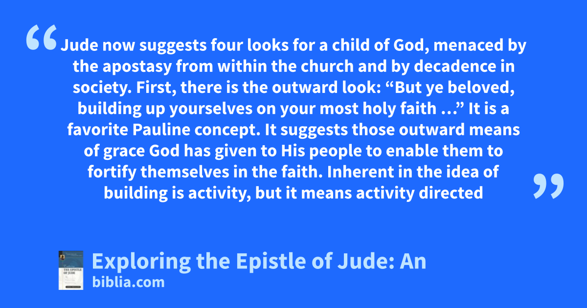 Jude now suggests four looks for a child of God, menaced by the apostasy from within the church and by decadence in society. First, there is the outward look: “But ye beloved, building up yourselves on your most holy faith …” It is a favorite Pauline concept. It suggests those outward means of grace God has given to His people to enable them to fortify themselves in the faith. Inherent in the idea of building is activity, but it means activity directed