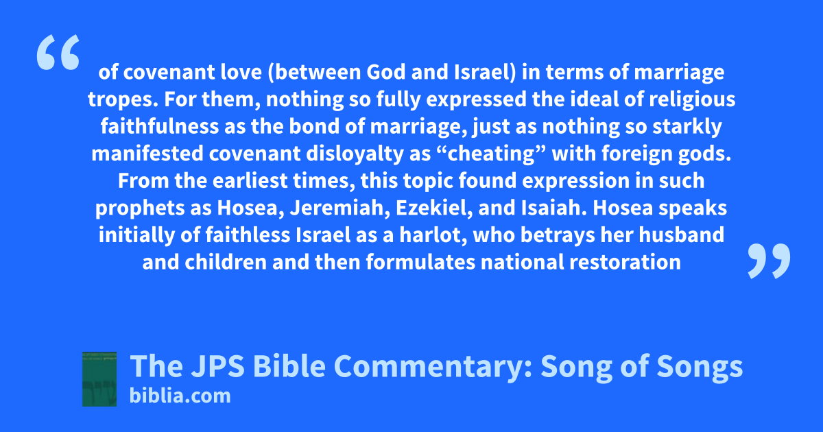 of covenant love (between God and Israel) in terms of marriage tropes. For them, nothing so fully expressed the ideal of religious faithfulness as the bond of marriage, just as nothing so starkly manifested covenant disloyalty as “cheating” with foreign gods. From the earliest times, this topic found expression in such prophets as Hosea, Jeremiah, Ezekiel, and Isaiah. Hosea speaks initially of faithless Israel as a harlot, who betrays her husband and children and then formulates national restoration