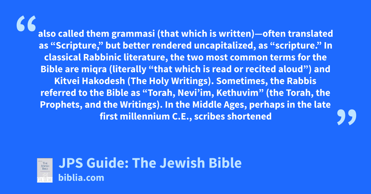 also called them grammasi (that which is written)—often translated as “Scripture,” but better rendered uncapitalized, as “scripture.” In classical Rabbinic literature, the two most common terms for the Bible are miqra (literally “that which is read or recited aloud”) and Kitvei Hakodesh (The Holy Writings). Sometimes, the Rabbis referred to the Bible as “Torah, Nevi’im, Kethuvim” (the Torah, the Prophets, and the Writings). In the Middle Ages, perhaps in the late first millennium C.E., scribes shortened