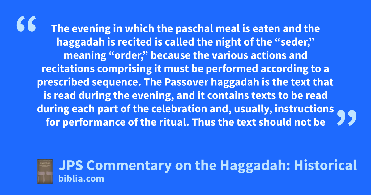 The evening in which the paschal meal is eaten and the haggadah is recited is called the night of the “seder,” meaning “order,” because the various actions and recitations comprising it must be performed according to a prescribed sequence. The Passover haggadah is the text that is read during the evening, and it contains texts to be read during each part of the celebration and, usually, instructions for performance of the ritual. Thus the text should not be
