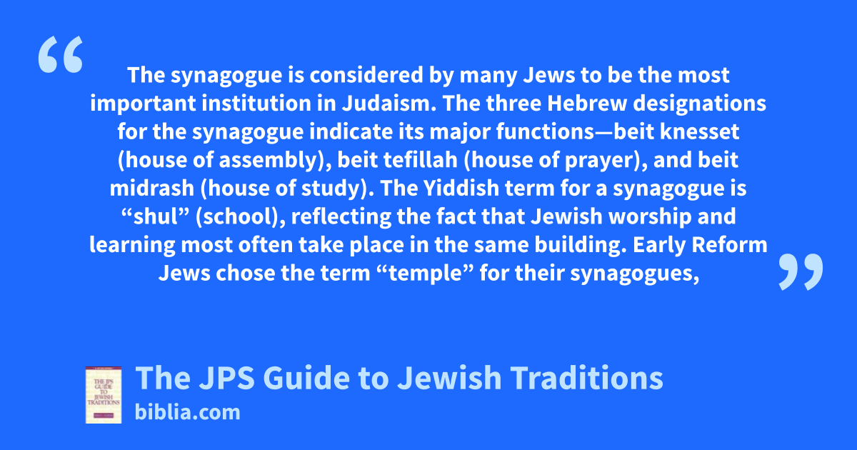 The synagogue is considered by many Jews to be the most important institution in Judaism. The three Hebrew designations for the synagogue indicate its major functions—beit knesset (house of assembly), beit tefillah (house of prayer), and beit midrash (house of study). The Yiddish term for a synagogue is “shul” (school), reflecting the fact that Jewish worship and learning most often take place in the same building. Early Reform Jews chose the term “temple” for their synagogues,