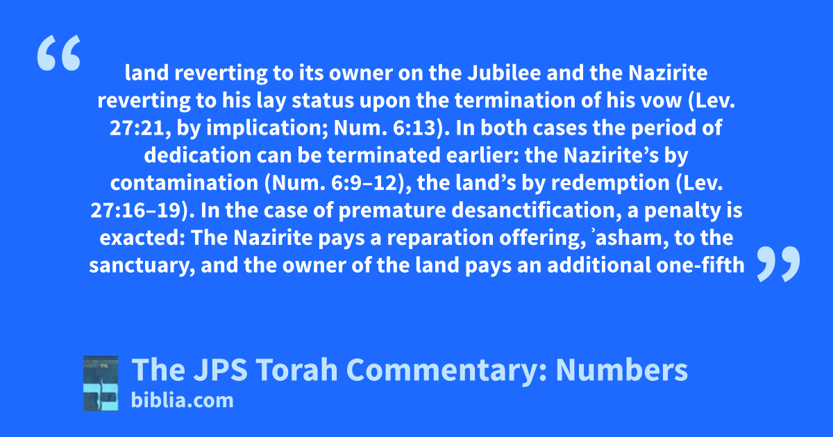 land reverting to its owner on the Jubilee and the Nazirite reverting to his lay status upon the termination of his vow (Lev. 27:21, by implication; Num. 6:13). In both cases the period of dedication can be terminated earlier: the Nazirite’s by contamination (Num. 6:9–12), the land’s by redemption (Lev. 27:16–19). In the case of premature desanctification, a penalty is exacted: The Nazirite pays a reparation offering, ʾasham, to the sanctuary, and the owner of the land pays an additional one-fifth