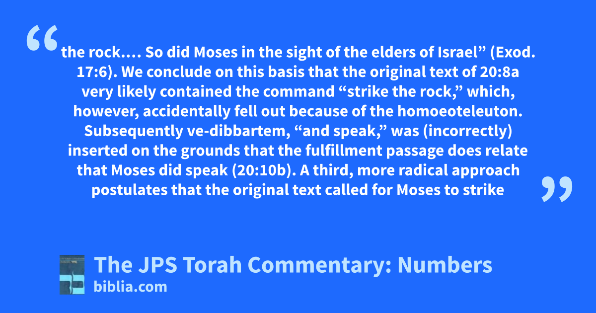 the rock.… So did Moses in the sight of the elders of Israel” (Exod. 17:6). We conclude on this basis that the original text of 20:8a very likely contained the command “strike the rock,” which, however, accidentally fell out because of the homoeoteleuton. Subsequently ve-dibbartem, “and speak,” was (incorrectly) inserted on the grounds that the fulfillment passage does relate that Moses did speak (20:10b). A third, more radical approach postulates that the original text called for Moses to strike