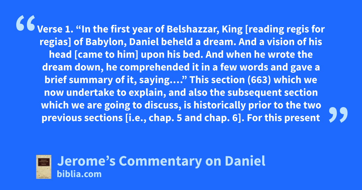 Verse 1. “In the first year of Belshazzar, King [reading regis for regias] of Babylon, Daniel beheld a dream. And a vision of his head [came to him] upon his bed. And when he wrote the dream down, he comprehended it in a few words and gave a brief summary of it, saying.…” This section (663) which we now undertake to explain, and also the subsequent section which we are going to discuss, is historically prior to the two previous sections [i.e., chap. 5 and chap. 6]. For this present