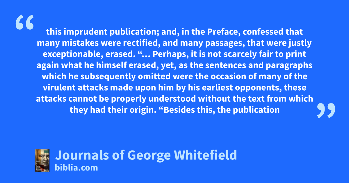 this imprudent publication; and, in the Preface, confessed that many mistakes were rectified, and many passages, that were justly exceptionable, erased. “… Perhaps, it is not scarcely fair to print again what he himself erased, yet, as the sentences and paragraphs which he subsequently omitted were the occasion of many of the virulent attacks made upon him by his earliest opponents, these attacks cannot be properly understood without the text from which they had their origin. “Besides this, the publication