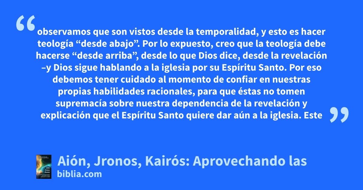 observamos que son vistos desde la temporalidad, y esto es hacer teología “desde abajo”. Por lo expuesto, creo que la teología debe hacerse “desde arriba”, desde lo que Dios dice, desde la revelación –y Dios sigue hablando a la iglesia por su Espíritu Santo. Por eso debemos tener cuidado al momento de confiar en nuestras propias habilidades racionales, para que éstas no tomen supremacía sobre nuestra dependencia de la revelación y explicación que el Espíritu Santo quiere dar aún a la iglesia. Este