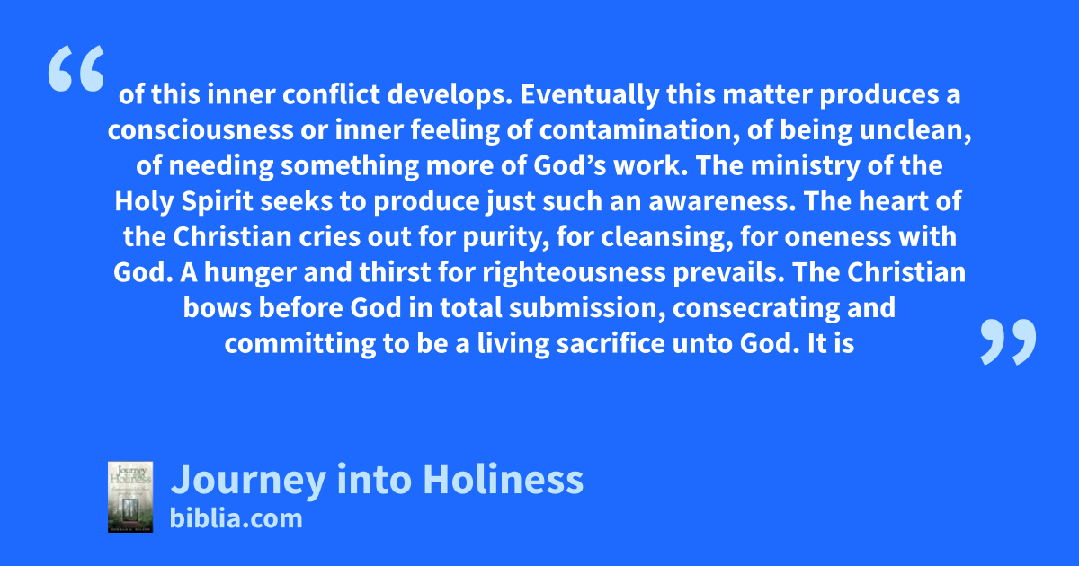of this inner conflict develops. Eventually this matter produces a consciousness or inner feeling of contamination, of being unclean, of needing something more of God’s work. The ministry of the Holy Spirit seeks to produce just such an awareness. The heart of the Christian cries out for purity, for cleansing, for oneness with God. A hunger and thirst for righteousness prevails. The Christian bows before God in total submission, consecrating and committing to be a living sacrifice unto God. It is