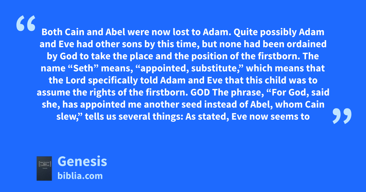 Both Cain and Abel were now lost to Adam. Quite possibly Adam and Eve had other sons by this time, but none had been ordained by God to take the place and the position of the firstborn. The name “Seth” means, “appointed, substitute,” which means that the Lord specifically told Adam and Eve that this child was to assume the rights of the firstborn. GOD The phrase, “For God, said she, has appointed me another seed instead of Abel, whom Cain slew,” tells us several things: As stated, Eve now seems to