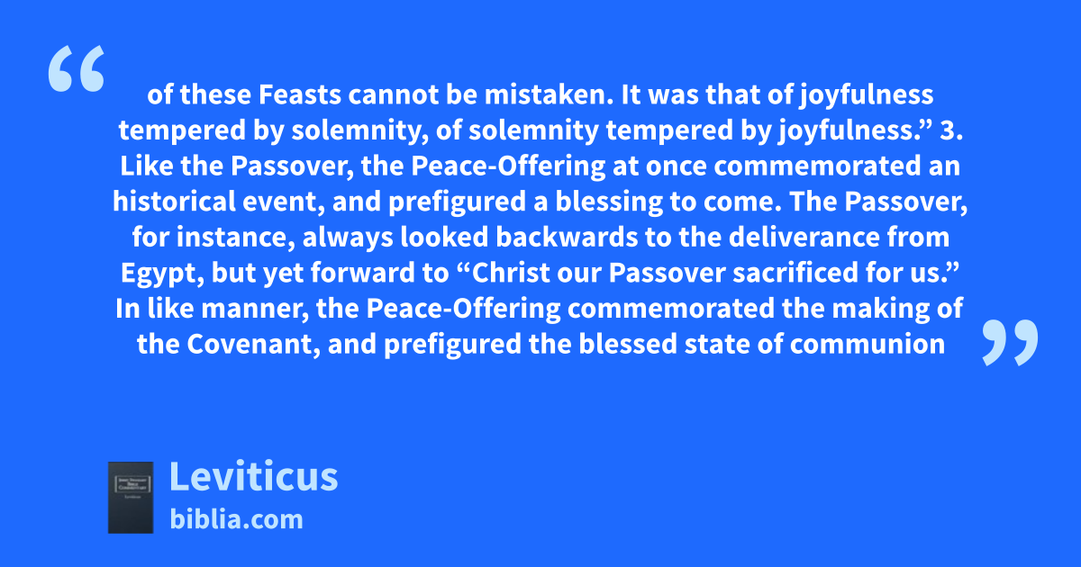 of these Feasts cannot be mistaken. It was that of joyfulness tempered by solemnity, of solemnity tempered by joyfulness.” 3. Like the Passover, the Peace-Offering at once commemorated an historical event, and prefigured a blessing to come. The Passover, for instance, always looked backwards to the deliverance from Egypt, but yet forward to “Christ our Passover sacrificed for us.” In like manner, the Peace-Offering commemorated the making of the Covenant, and prefigured the blessed state of communion