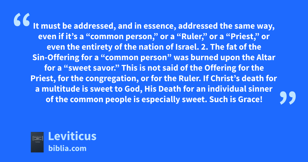 It must be addressed, and in essence, addressed the same way, even if it’s a “common person,” or a “Ruler,” or a “Priest,” or even the entirety of the nation of Israel. 2. The fat of the Sin-Offering for a “common person” was burned upon the Altar for a “sweet savor.” This is not said of the Offering for the Priest, for the congregation, or for the Ruler. If Christ’s death for a multitude is sweet to God, His Death for an individual sinner of the common people is especially sweet. Such is Grace!