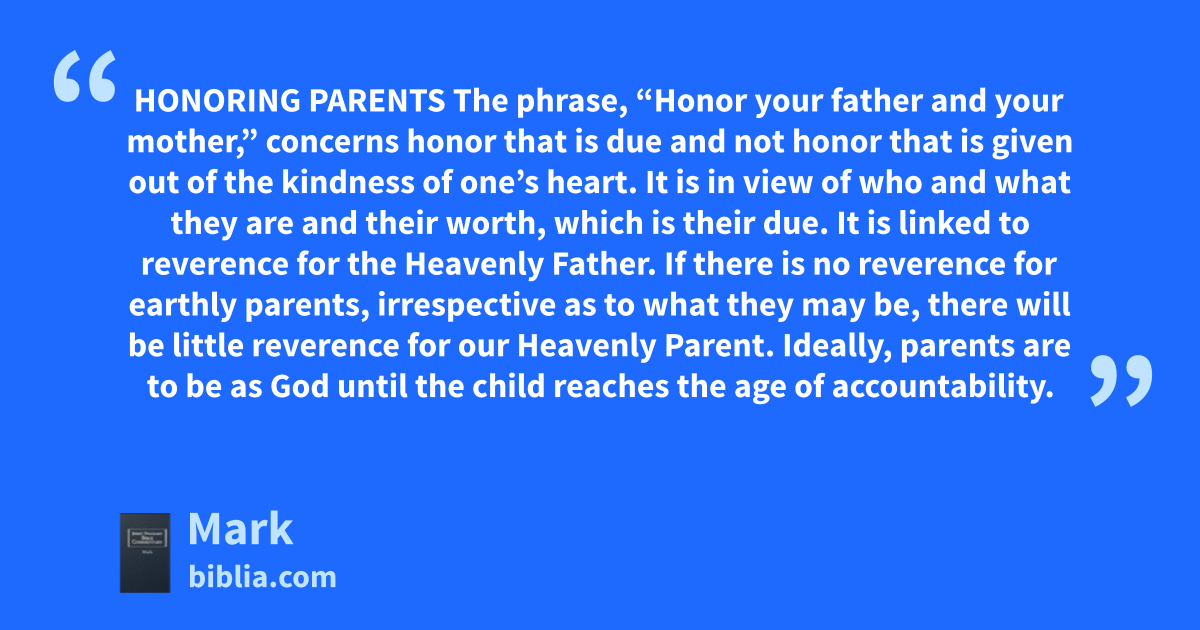 HONORING PARENTS The phrase, “Honor your father and your mother,” concerns honor that is due and not honor that is given out of the kindness of one’s heart. It is in view of who and what they are and their worth, which is their due. It is linked to reverence for the Heavenly Father. If there is no reverence for earthly parents, irrespective as to what they may be, there will be little reverence for our Heavenly Parent. Ideally, parents are to be as God until the child reaches the age of accountability.