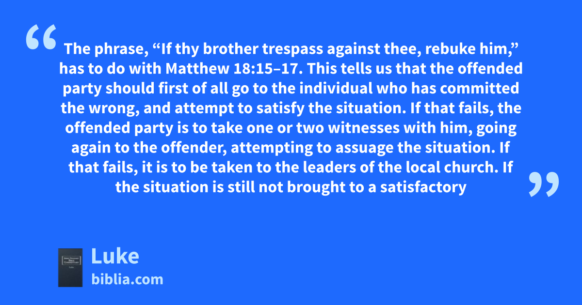 The phrase, “If thy brother trespass against thee, rebuke him,” has to do with Matthew 18:15–17. This tells us that the offended party should first of all go to the individual who has committed the wrong, and attempt to satisfy the situation. If that fails, the offended party is to take one or two witnesses with him, going again to the offender, attempting to assuage the situation. If that fails, it is to be taken to the leaders of the local church. If the situation is still not brought to a satisfactory