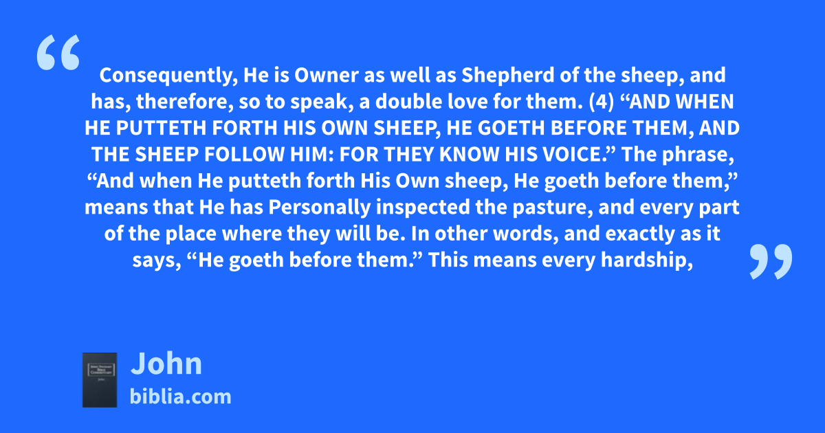 Consequently, He is Owner as well as Shepherd of the sheep, and has, therefore, so to speak, a double love for them. (4) “AND WHEN HE PUTTETH FORTH HIS OWN SHEEP, HE GOETH BEFORE THEM, AND THE SHEEP FOLLOW HIM: FOR THEY KNOW HIS VOICE.” The phrase, “And when He putteth forth His Own sheep, He goeth before them,” means that He has Personally inspected the pasture, and every part of the place where they will be. In other words, and exactly as it says, “He goeth before them.” This means every hardship,