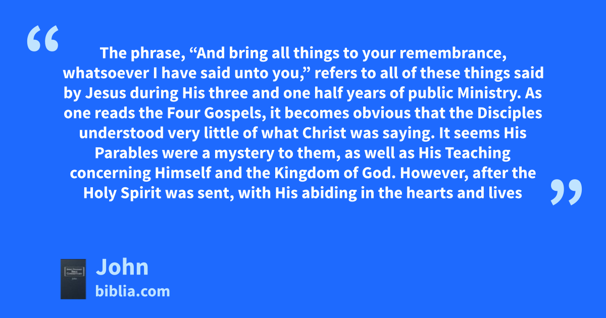 The phrase, “And bring all things to your remembrance, whatsoever I have said unto you,” refers to all of these things said by Jesus during His three and one half years of public Ministry. As one reads the Four Gospels, it becomes obvious that the Disciples understood very little of what Christ was saying. It seems His Parables were a mystery to them, as well as His Teaching concerning Himself and the Kingdom of God. However, after the Holy Spirit was sent, with His abiding in the hearts and lives