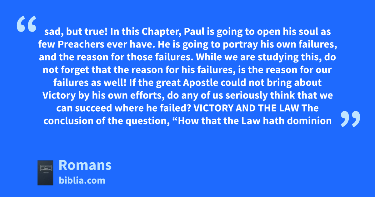 sad, but true! In this Chapter, Paul is going to open his soul as few Preachers ever have. He is going to portray his own failures, and the reason for those failures. While we are studying this, do not forget that the reason for his failures, is the reason for our failures as well! If the great Apostle could not bring about Victory by his own efforts, do any of us seriously think that we can succeed where he failed? VICTORY AND THE LAW The conclusion of the question, “How that the Law hath dominion