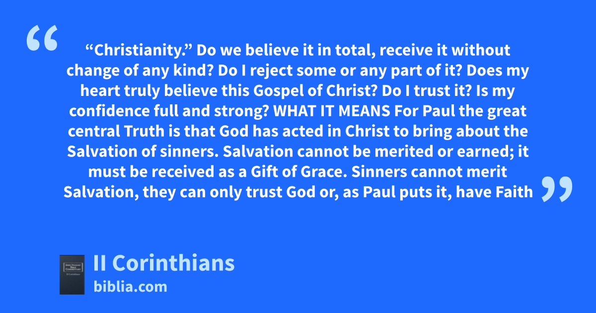 “Christianity.” Do we believe it in total, receive it without change of any kind? Do I reject some or any part of it? Does my heart truly believe this Gospel of Christ? Do I trust it? Is my confidence full and strong? WHAT IT MEANS For Paul the great central Truth is that God has acted in Christ to bring about the Salvation of sinners. Salvation cannot be merited or earned; it must be received as a Gift of Grace. Sinners cannot merit Salvation, they can only trust God or, as Paul puts it, have Faith
