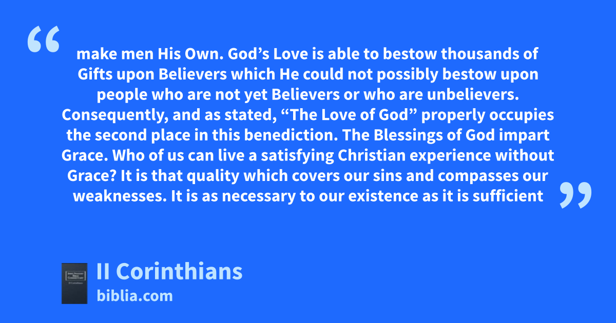 make men His Own. God’s Love is able to bestow thousands of Gifts upon Believers which He could not possibly bestow upon people who are not yet Believers or who are unbelievers. Consequently, and as stated, “The Love of God” properly occupies the second place in this benediction. The Blessings of God impart Grace. Who of us can live a satisfying Christian experience without Grace? It is that quality which covers our sins and compasses our weaknesses. It is as necessary to our existence as it is sufficient