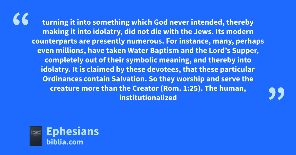 turning it into something which God never intended, thereby making it into idolatry, did not die with the Jews. Its modern counterparts are presently numerous. For instance, many, perhaps even millions, have taken Water Baptism and the Lord’s Supper, completely out of their symbolic meaning, and thereby into idolatry. It is claimed by these devotees, that these particular Ordinances contain Salvation. So they worship and serve the creature more than the Creator (Rom. 1:25). The human, institutionalized