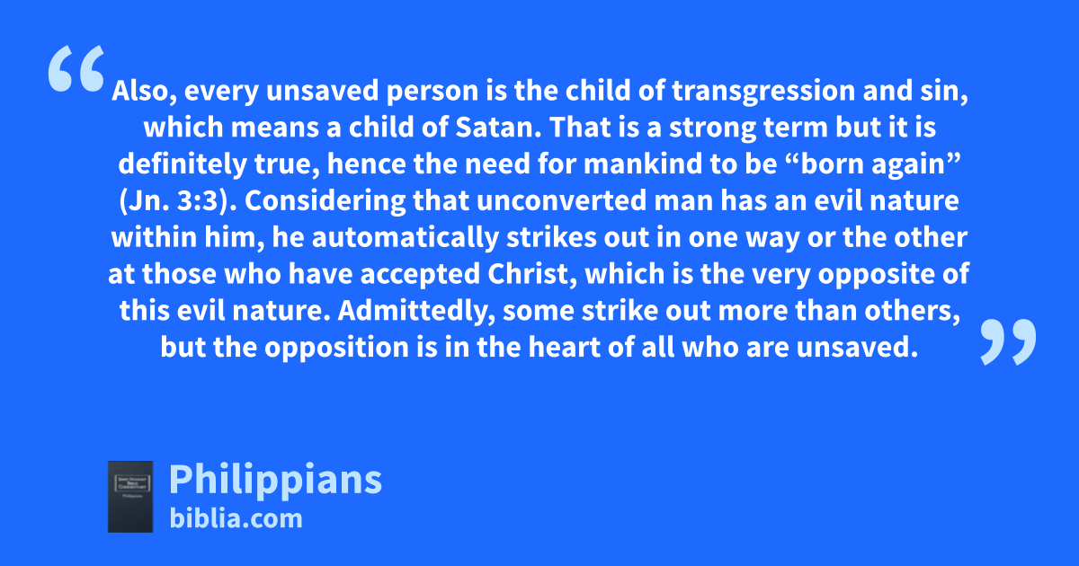Also, every unsaved person is the child of transgression and sin, which means a child of Satan. That is a strong term but it is definitely true, hence the need for mankind to be “born again” (Jn. 3:3). Considering that unconverted man has an evil nature within him, he automatically strikes out in one way or the other at those who have accepted Christ, which is the very opposite of this evil nature. Admittedly, some strike out more than others, but the opposition is in the heart of all who are unsaved.