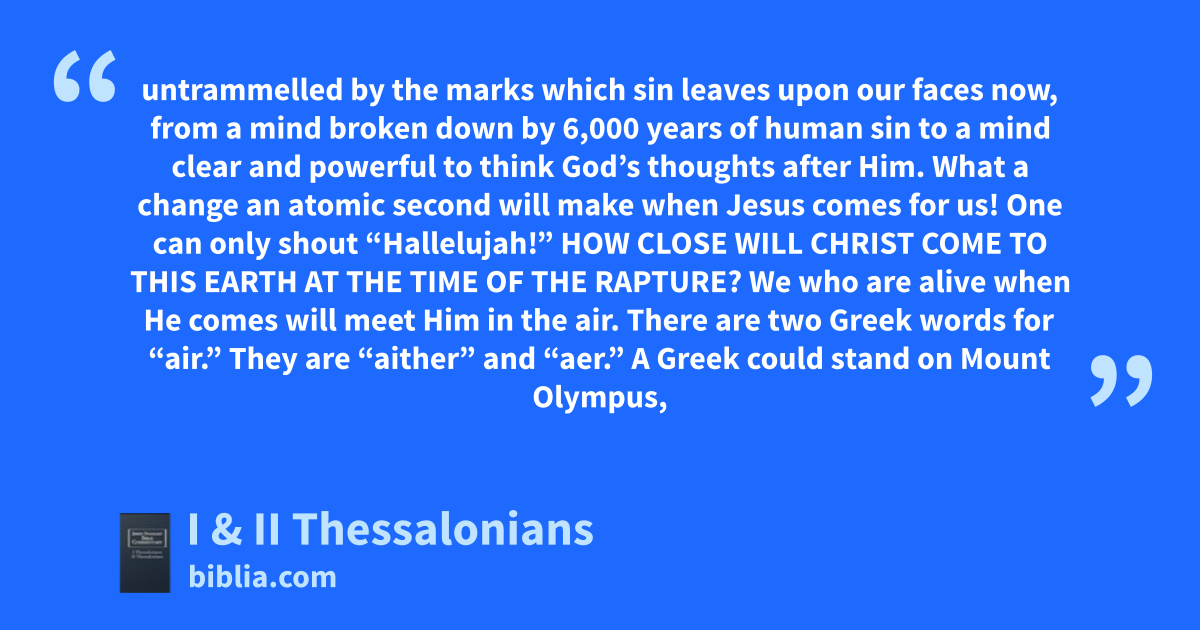 untrammelled by the marks which sin leaves upon our faces now, from a mind broken down by 6,000 years of human sin to a mind clear and powerful to think God’s thoughts after Him. What a change an atomic second will make when Jesus comes for us! One can only shout “Hallelujah!” HOW CLOSE WILL CHRIST COME TO THIS EARTH AT THE TIME OF THE RAPTURE? We who are alive when He comes will meet Him in the air. There are two Greek words for “air.” They are “aither” and “aer.” A Greek could stand on Mount Olympus,