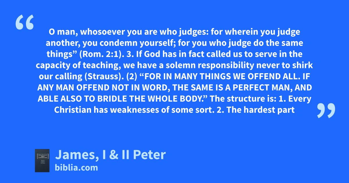 O man, whosoever you are who judges: for wherein you judge another, you condemn yourself; for you who judge do the same things” (Rom. 2:1). 3. If God has in fact called us to serve in the capacity of teaching, we have a solemn responsibility never to shirk our calling (Strauss). (2) “FOR IN MANY THINGS WE OFFEND ALL. IF ANY MAN OFFEND NOT IN WORD, THE SAME IS A PERFECT MAN, AND ABLE ALSO TO BRIDLE THE WHOLE BODY.” The structure is: 1. Every Christian has weaknesses of some sort. 2. The hardest part