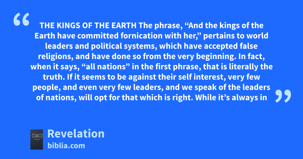 THE KINGS OF THE EARTH The phrase, “And the kings of the Earth have committed fornication with her,” pertains to world leaders and political systems, which have accepted false religions, and have done so from the very beginning. In fact, when it says, “all nations” in the first phrase, that is literally the truth. If it seems to be against their self interest, very few people, and even very few leaders, and we speak of the leaders of nations, will opt for that which is right. While it’s always in