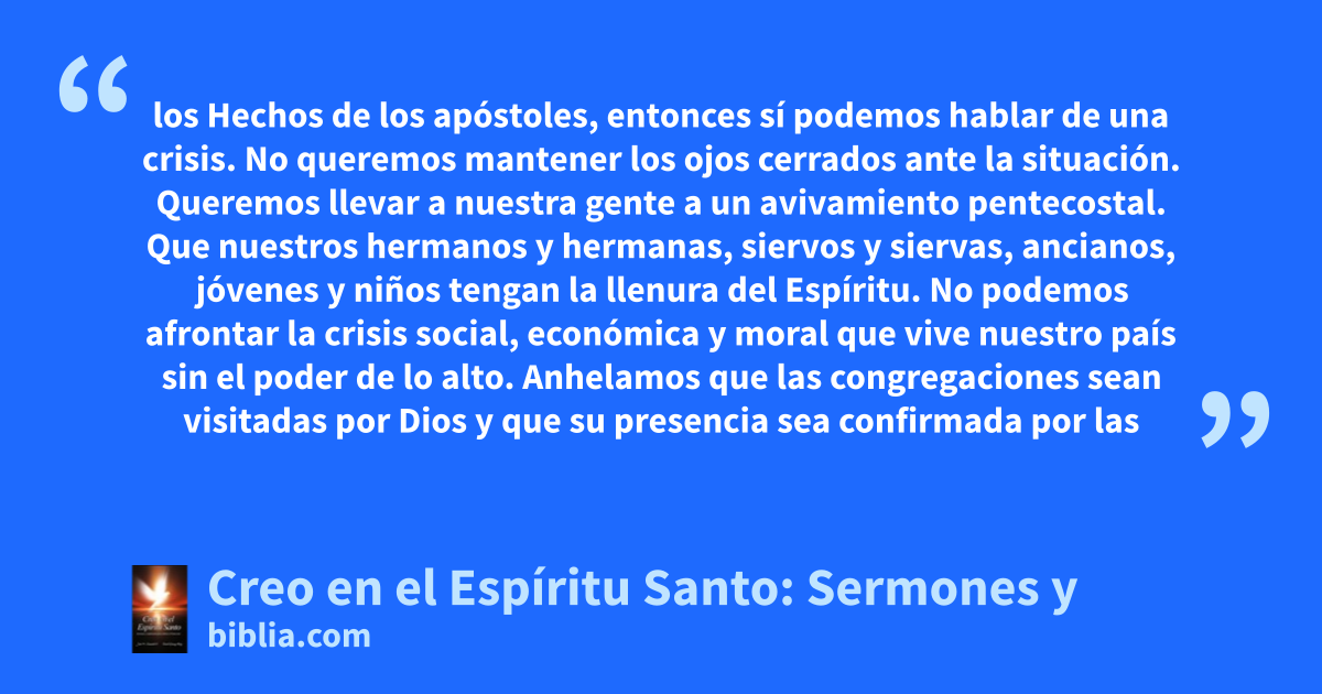 los Hechos de los apóstoles, entonces sí podemos hablar de una crisis. No queremos mantener los ojos cerrados ante la situación. Queremos llevar a nuestra gente a un avivamiento pentecostal. Que nuestros hermanos y hermanas, siervos y siervas, ancianos, jóvenes y niños tengan la llenura del Espíritu. No podemos afrontar la crisis social, económica y moral que vive nuestro país sin el poder de lo alto. Anhelamos que las congregaciones sean visitadas por Dios y que su presencia sea confirmada por las
