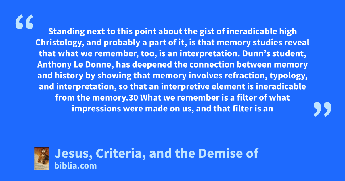 Standing next to this point about the gist of ineradicable high Christology, and probably a part of it, is that memory studies reveal that what we remember, too, is an interpretation. Dunn’s student, Anthony Le Donne, has deepened the connection between memory and history by showing that memory involves refraction, typology, and interpretation, so that an interpretive element is ineradicable from the memory.30 What we remember is a filter of what impressions were made on us, and that filter is an