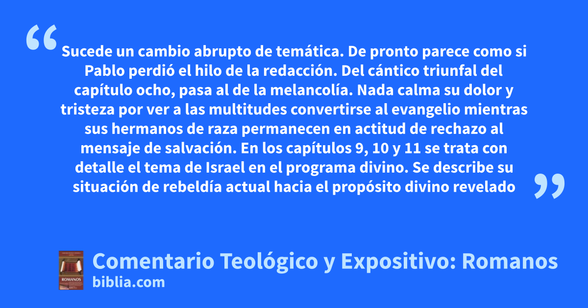 Sucede un cambio abrupto de temática. De pronto parece como si Pablo perdió el hilo de la redacción. Del cántico triunfal del capítulo ocho, pasa al de la melancolía. Nada calma su dolor y tristeza por ver a las multitudes convertirse al evangelio mientras sus hermanos de raza permanecen en actitud de rechazo al mensaje de salvación. En los capítulos 9, 10 y 11 se trata con detalle el tema de Israel en el programa divino. Se describe su situación de rebeldía actual hacia el propósito divino revelado