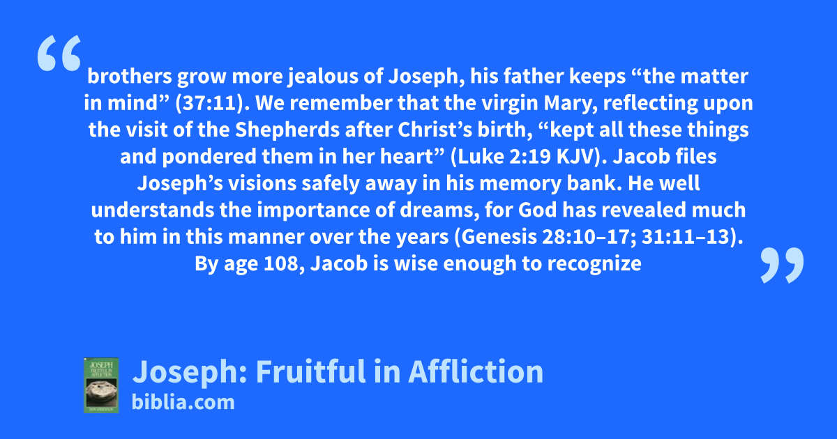 brothers grow more jealous of Joseph, his father keeps “the matter in mind” (37:11). We remember that the virgin Mary, reflecting upon the visit of the Shepherds after Christ’s birth, “kept all these things and pondered them in her heart” (Luke 2:19 KJV). Jacob files Joseph’s visions safely away in his memory bank. He well understands the importance of dreams, for God has revealed much to him in this manner over the years (Genesis 28:10–17; 31:11–13). By age 108, Jacob is wise enough to recognize