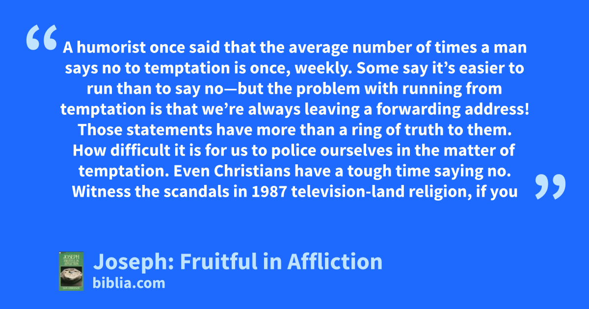 A humorist once said that the average number of times a man says no to temptation is once, weekly. Some say it’s easier to run than to say no—but the problem with running from temptation is that we’re always leaving a forwarding address! Those statements have more than a ring of truth to them. How difficult it is for us to police ourselves in the matter of temptation. Even Christians have a tough time saying no. Witness the scandals in 1987 television-land religion, if you