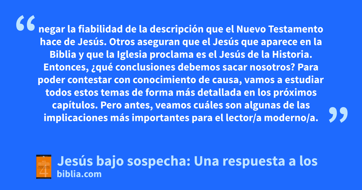 negar la fiabilidad de la descripción que el Nuevo Testamento hace de Jesús. Otros aseguran que el Jesús que aparece en la Biblia y que la Iglesia proclama es el Jesús de la Historia. Entonces, ¿qué conclusiones debemos sacar nosotros? Para poder contestar con conocimiento de causa, vamos a estudiar todos estos temas de forma más detallada en los próximos capítulos. Pero antes, veamos cuáles son algunas de las implicaciones más importantes para el lector/a moderno/a.