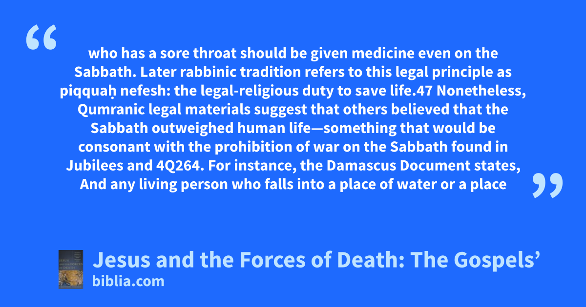 who has a sore throat should be given medicine even on the Sabbath. Later rabbinic tradition refers to this legal principle as piqquaḥ nefesh: the legal-religious duty to save life.47 Nonetheless, Qumranic legal materials suggest that others believed that the Sabbath outweighed human life—something that would be consonant with the prohibition of war on the Sabbath found in Jubilees and 4Q264. For instance, the Damascus Document states, And any living person who falls into a place of water or a place