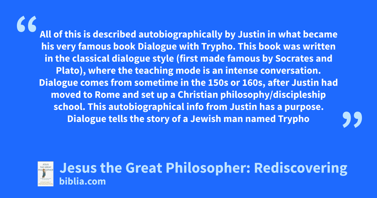 All of this is described autobiographically by Justin in what became his very famous book Dialogue with Trypho. This book was written in the classical dialogue style (first made famous by Socrates and Plato), where the teaching mode is an intense conversation. Dialogue comes from sometime in the 150s or 160s, after Justin had moved to Rome and set up a Christian philosophy/discipleship school. This autobiographical info from Justin has a purpose. Dialogue tells the story of a Jewish man named Trypho