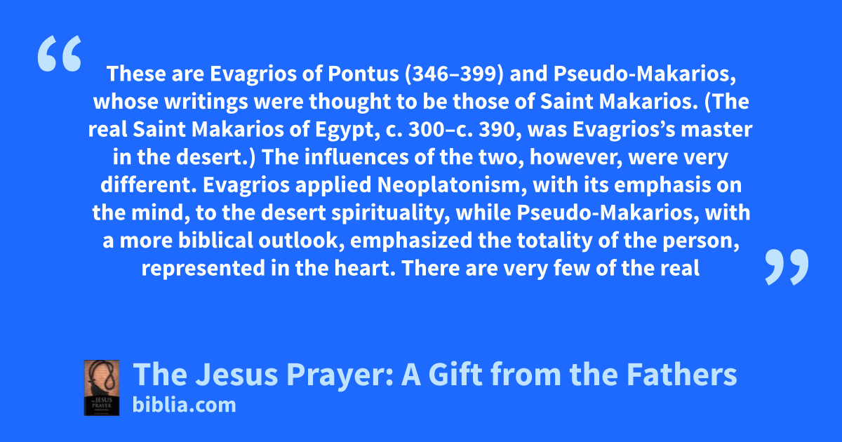 These are Evagrios of Pontus (346–399) and Pseudo-Makarios, whose writings were thought to be those of Saint Makarios. (The real Saint Makarios of Egypt, c. 300–c. 390, was Evagrios’s master in the desert.) The influences of the two, however, were very different. Evagrios applied Neoplatonism, with its emphasis on the mind, to the desert spirituality, while Pseudo-Makarios, with a more biblical outlook, emphasized the totality of the person, represented in the heart. There are very few of the real