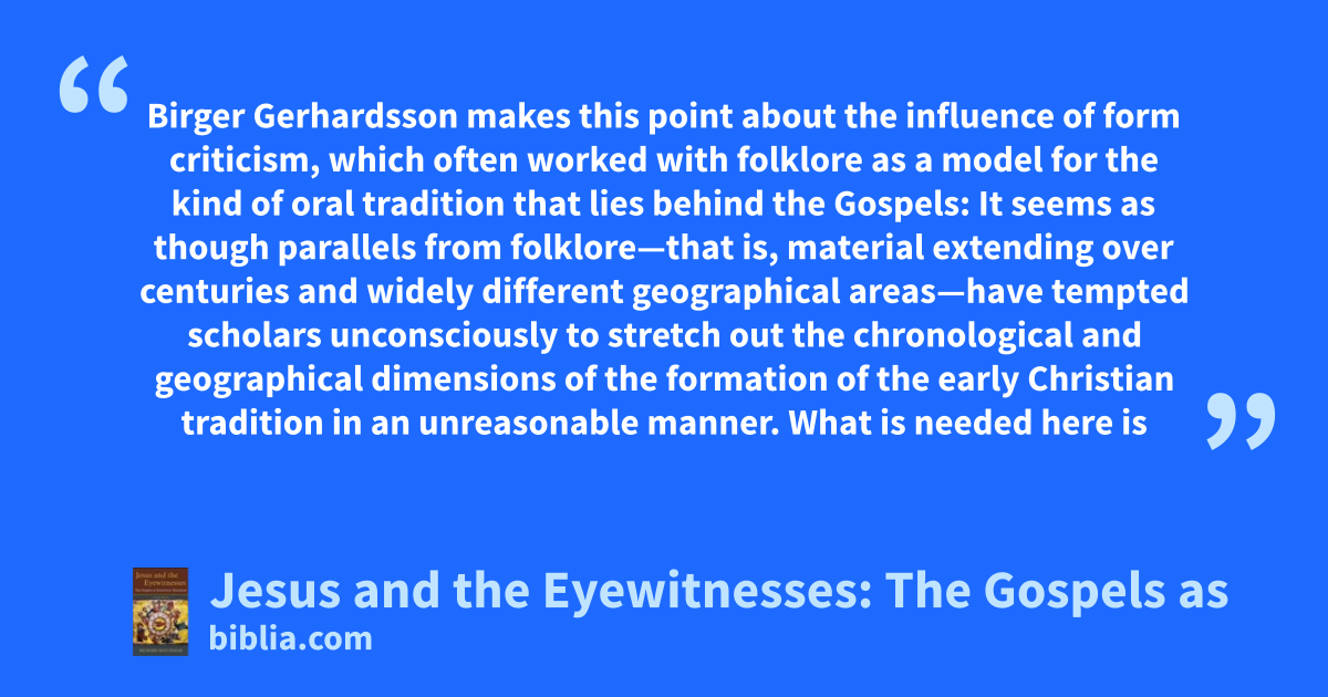 Birger Gerhardsson makes this point about the influence of form criticism, which often worked with folklore as a model for the kind of oral tradition that lies behind the Gospels: It seems as though parallels from folklore—that is, material extending over centuries and widely different geographical areas—have tempted scholars unconsciously to stretch out the chronological and geographical dimensions of the formation of the early Christian tradition in an unreasonable manner. What is needed here is