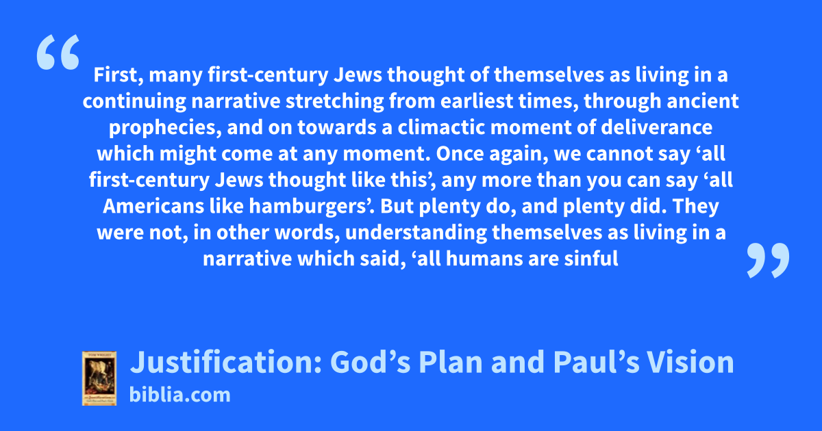First, many first-century Jews thought of themselves as living in a continuing narrative stretching from earliest times, through ancient prophecies, and on towards a climactic moment of deliverance which might come at any moment. Once again, we cannot say ‘all first-century Jews thought like this’, any more than you can say ‘all Americans like hamburgers’. But plenty do, and plenty did. They were not, in other words, understanding themselves as living in a narrative which said, ‘all humans are sinful