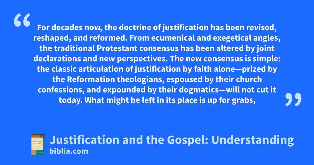 For decades now, the doctrine of justification has been revised, reshaped, and reformed. From ecumenical and exegetical angles, the traditional Protestant consensus has been altered by joint declarations and new perspectives. The new consensus is simple: the classic articulation of justification by faith alone—prized by the Reformation theologians, espoused by their church confessions, and expounded by their dogmatics—will not cut it today. What might be left in its place is up for grabs,