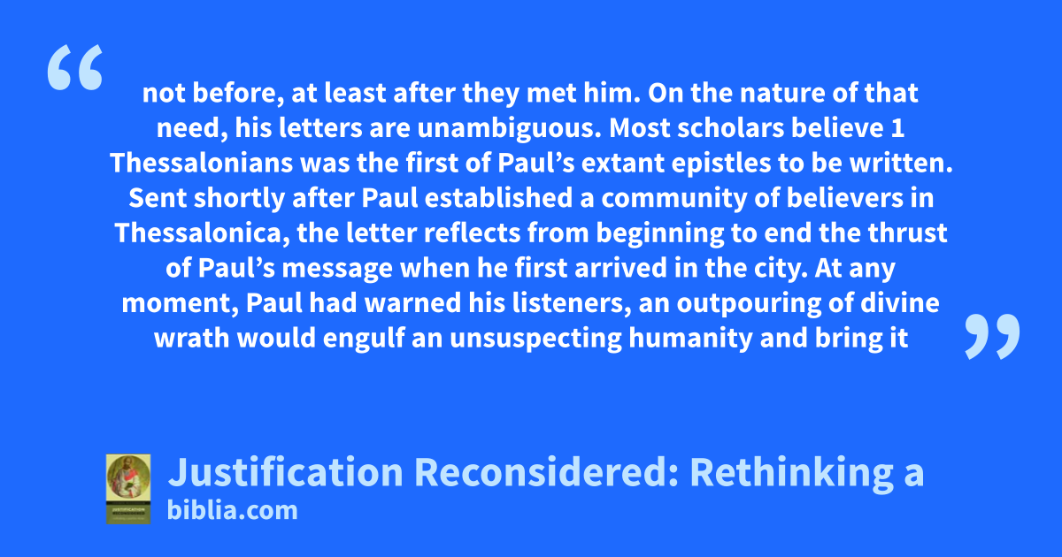 not before, at least after they met him. On the nature of that need, his letters are unambiguous. Most scholars believe 1 Thessalonians was the first of Paul’s extant epistles to be written. Sent shortly after Paul established a community of believers in Thessalonica, the letter reflects from beginning to end the thrust of Paul’s message when he first arrived in the city. At any moment, Paul had warned his listeners, an outpouring of divine wrath would engulf an unsuspecting humanity and bring it