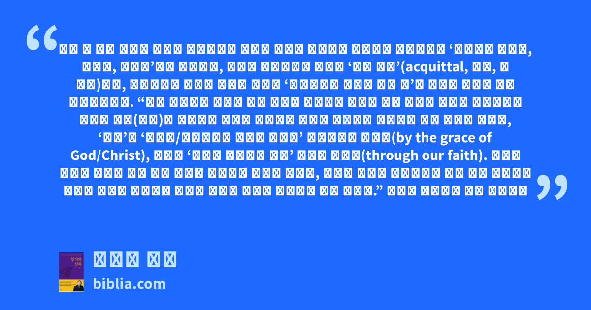 얻는 그 구원 사건의 열매도 마찬가지로 법정적 범주로 이해하여 하나님의 심판석에서 ‘의인이라 칭해짐, 선언됨, 인정됨’으로 해석하고, 그것을 부정적으로 말하면 ‘무죄 선언’(acquittal, 사면, 죄 용서)이고, 긍정적으로 말하면 하나님 앞에서 ‘의인이라는 신분을 얻게 됨’을 뜻하는 것으로 부연 설명했습니다. “우리 죄인들이 율법을 지켜 스스로 의로움을 이루지 못한 가운데 오로지 그리스도의 대속의 제사(은혜)로 이루어진 구원을 선포하는 복음을 믿음으로 의인이라 칭함 받음을 얻으니, ‘칭의’는 ‘하나님/그리스도의 은혜에 의해서’ 이루어지는 것이며(by the grace of God/Christ), 우리의 ‘믿음을 수단으로 하여’ 덕입는 것이다(through our faith). 우리가 복음을 믿으면 지금 벌써 우리는 의인이라 칭함을 받는데, 그것은 종말에 그리스도의 재림 때에 하나님의 심판대 앞에서 확인되어 우리가 구원의 완성에 들어가게 되는 것이다.” 이것이 종교개혁 이래 개신교가