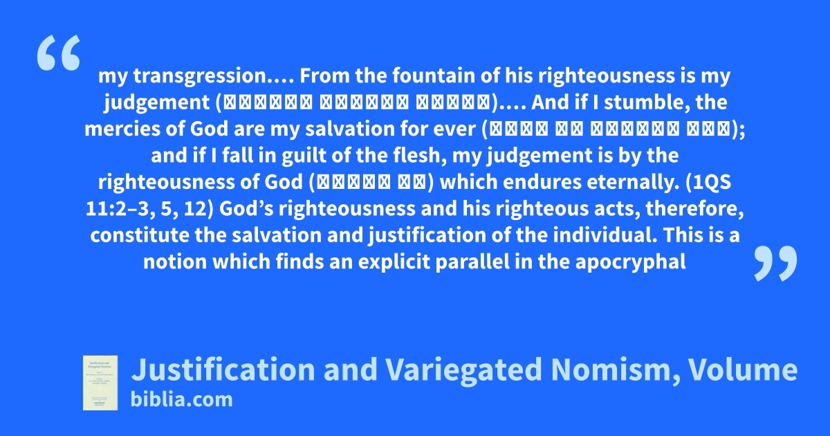 my transgression.… From the fountain of his righteousness is my judgement (וממקור צדקתקו משפטי).… And if I stumble, the mercies of God are my salvation for ever (חסדי אל ישוצתי לצד); and if I fall in guilt of the flesh, my judgement is by the righteousness of God (בצדקת אל) which endures eternally. (1QS 11:2–3, 5, 12) God’s righteousness and his righteous acts, therefore, constitute the salvation and justification of the individual. This is a notion which finds an explicit parallel in the apocryphal