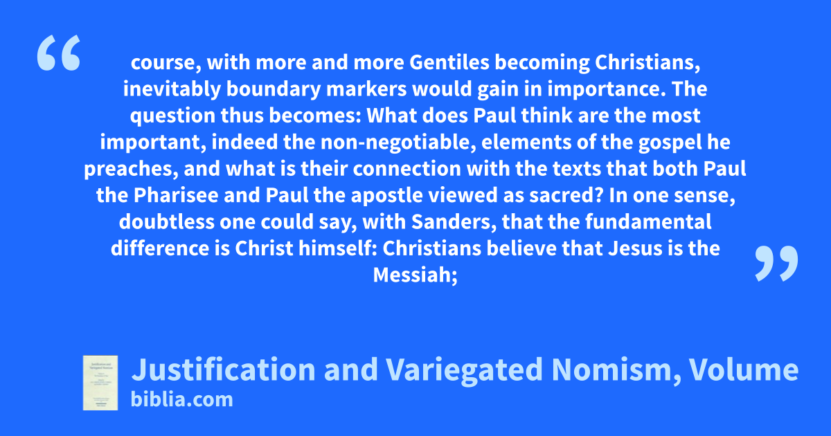 course, with more and more Gentiles becoming Christians, inevitably boundary markers would gain in importance. The question thus becomes: What does Paul think are the most important, indeed the non-negotiable, elements of the gospel he preaches, and what is their connection with the texts that both Paul the Pharisee and Paul the apostle viewed as sacred? In one sense, doubtless one could say, with Sanders, that the fundamental difference is Christ himself: Christians believe that Jesus is the Messiah;