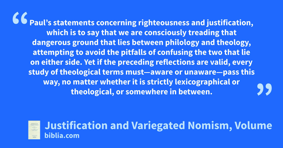 Paul’s statements concerning righteousness and justification, which is to say that we are consciously treading that dangerous ground that lies between philology and theology, attempting to avoid the pitfalls of confusing the two that lie on either side. Yet if the preceding reflections are valid, every study of theological terms must—aware or unaware—pass this way, no matter whether it is strictly lexicographical or theological, or somewhere in between.
