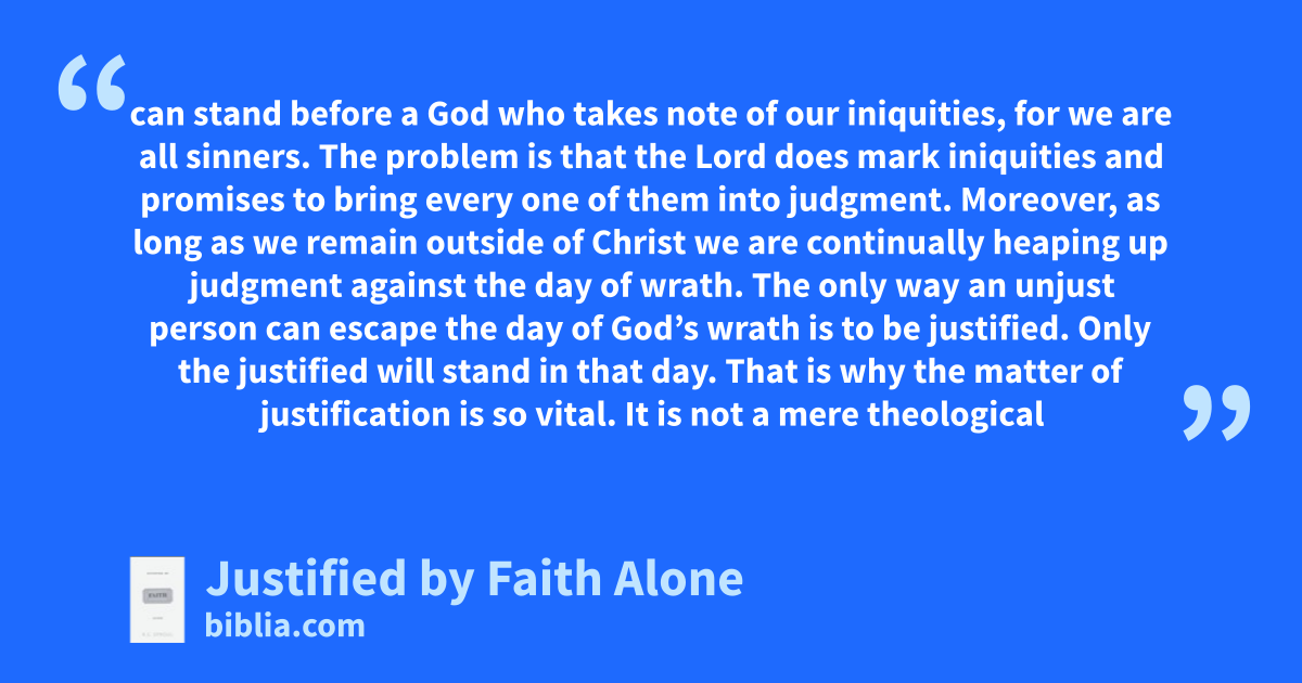 can stand before a God who takes note of our iniquities, for we are all sinners. The problem is that the Lord does mark iniquities and promises to bring every one of them into judgment. Moreover, as long as we remain outside of Christ we are continually heaping up judgment against the day of wrath. The only way an unjust person can escape the day of God’s wrath is to be justified. Only the justified will stand in that day. That is why the matter of justification is so vital. It is not a mere theological