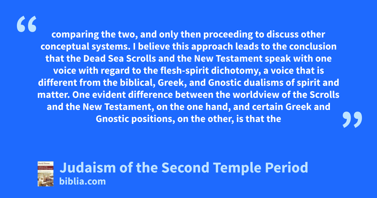 comparing the two, and only then proceeding to discuss other conceptual systems. I believe this approach leads to the conclusion that the Dead Sea Scrolls and the New Testament speak with one voice with regard to the flesh-spirit dichotomy, a voice that is different from the biblical, Greek, and Gnostic dualisms of spirit and matter. One evident difference between the worldview of the Scrolls and the New Testament, on the one hand, and certain Greek and Gnostic positions, on the other, is that the