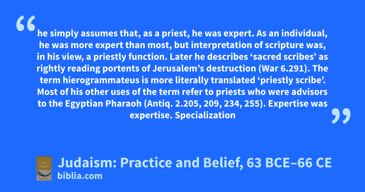 he simply assumes that, as a priest, he was expert. As an individual, he was more expert than most, but interpretation of scripture was, in his view, a priestly function. Later he describes ‘sacred scribes’ as rightly reading portents of Jerusalem’s destruction (War 6.291). The term hierogrammateus is more literally translated ‘priestly scribe’. Most of his other uses of the term refer to priests who were advisors to the Egyptian Pharaoh (Antiq. 2.205, 209, 234, 255). Expertise was expertise. Specialization
