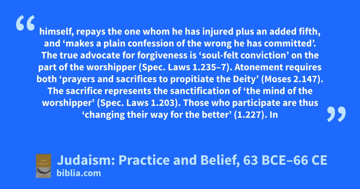 himself, repays the one whom he has injured plus an added fifth, and ‘makes a plain confession of the wrong he has committed’. The true advocate for forgiveness is ‘soul-felt conviction’ on the part of the worshipper (Spec. Laws 1.235–7). Atonement requires both ‘prayers and sacrifices to propitiate the Deity’ (Moses 2.147). The sacrifice represents the sanctification of ‘the mind of the worshipper’ (Spec. Laws 1.203). Those who participate are thus ‘changing their way for the better’ (1.227). In
