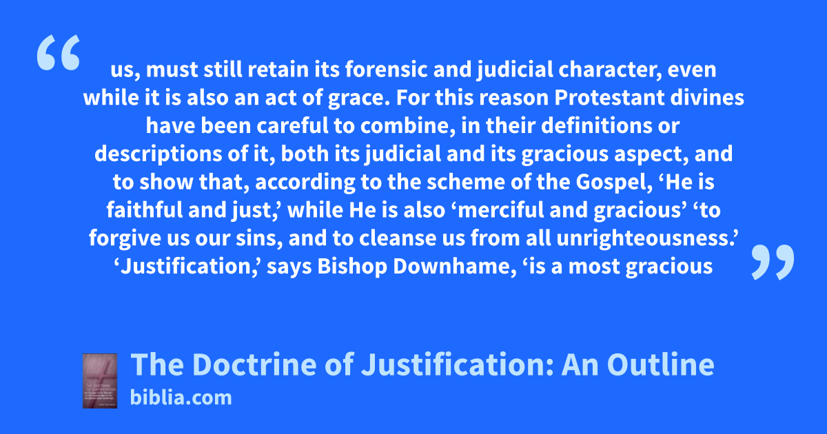 us, must still retain its forensic and judicial character, even while it is also an act of grace. For this reason Protestant divines have been careful to combine, in their definitions or descriptions of it, both its judicial and its gracious aspect, and to show that, according to the scheme of the Gospel, ‘He is faithful and just,’ while He is also ‘merciful and gracious’ ‘to forgive us our sins, and to cleanse us from all unrighteousness.’ ‘Justification,’ says Bishop Downhame, ‘is a most gracious