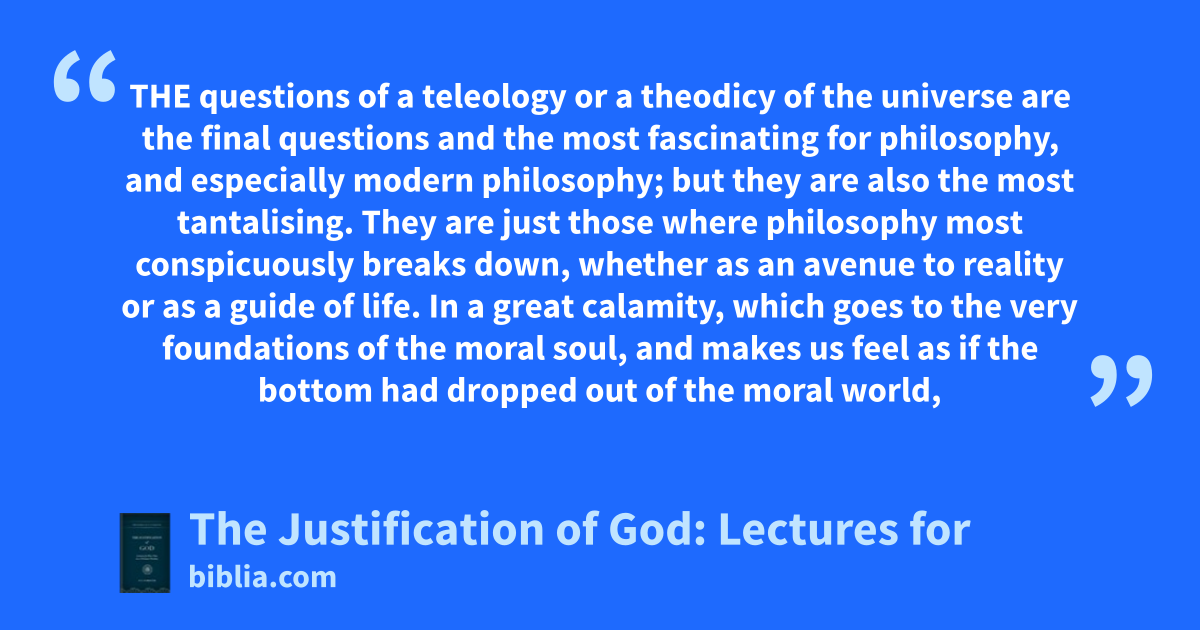 THE questions of a teleology or a theodicy of the universe are the final questions and the most fascinating for philosophy, and especially modern philosophy; but they are also the most tantalising. They are just those where philosophy most conspicuously breaks down, whether as an avenue to reality or as a guide of life. In a great calamity, which goes to the very foundations of the moral soul, and makes us feel as if the bottom had dropped out of the moral world,