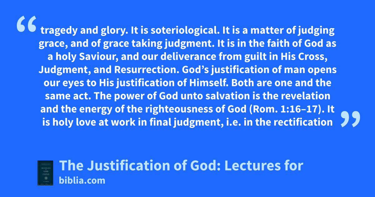 tragedy and glory. It is soteriological. It is a matter of judging grace, and of grace taking judgment. It is in the faith of God as a holy Saviour, and our deliverance from guilt in His Cross, Judgment, and Resurrection. God’s justification of man opens our eyes to His justification of Himself. Both are one and the same act. The power of God unto salvation is the revelation and the energy of the righteousness of God (Rom. 1:16–17). It is holy love at work in final judgment, i.e. in the rectification